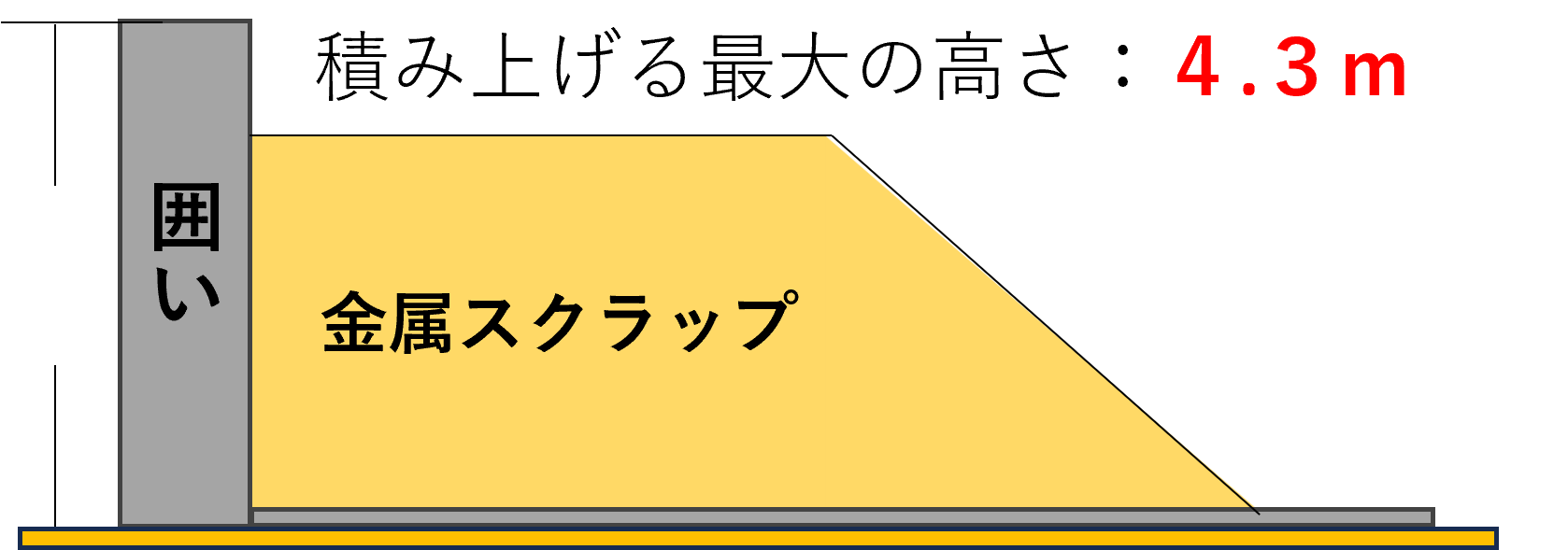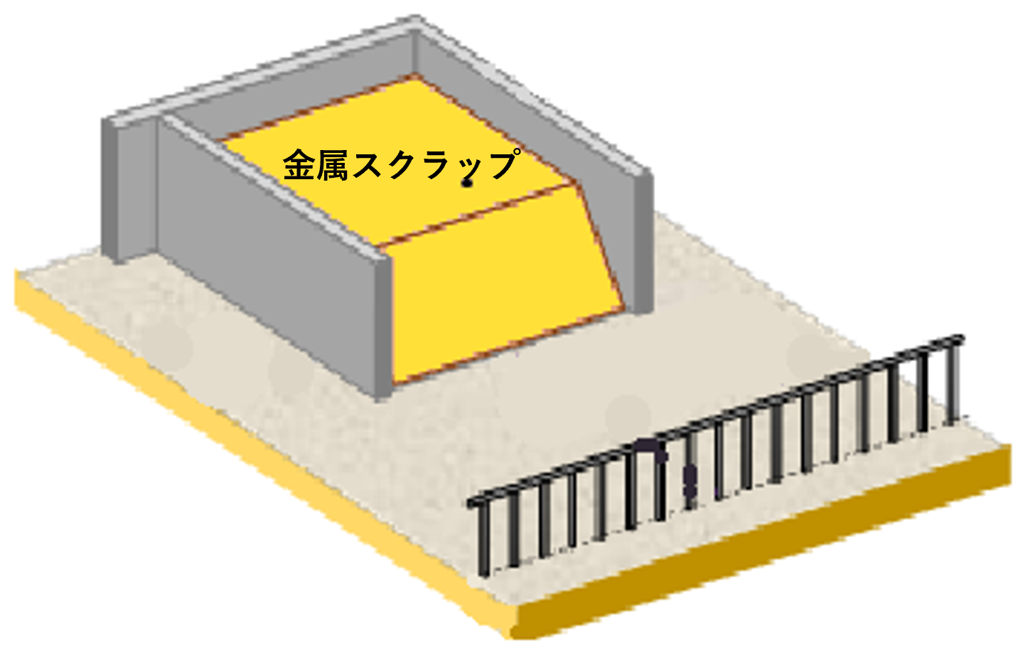 保管物の崩落・飛散を防止するため、先ほどご説明した頑丈な囲いに金属スクラップの荷重がかかるように保管致します。